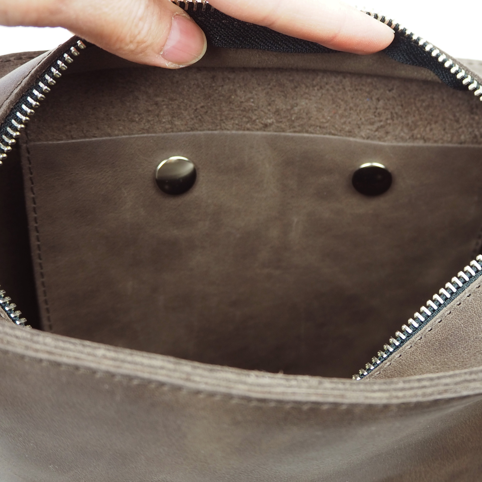 Sisällä kaksi taskua joista toisen kiinnityksenä vetoketju ja toisen kaksi nepparia. Taskujen mitat 17 x 17 cm.
