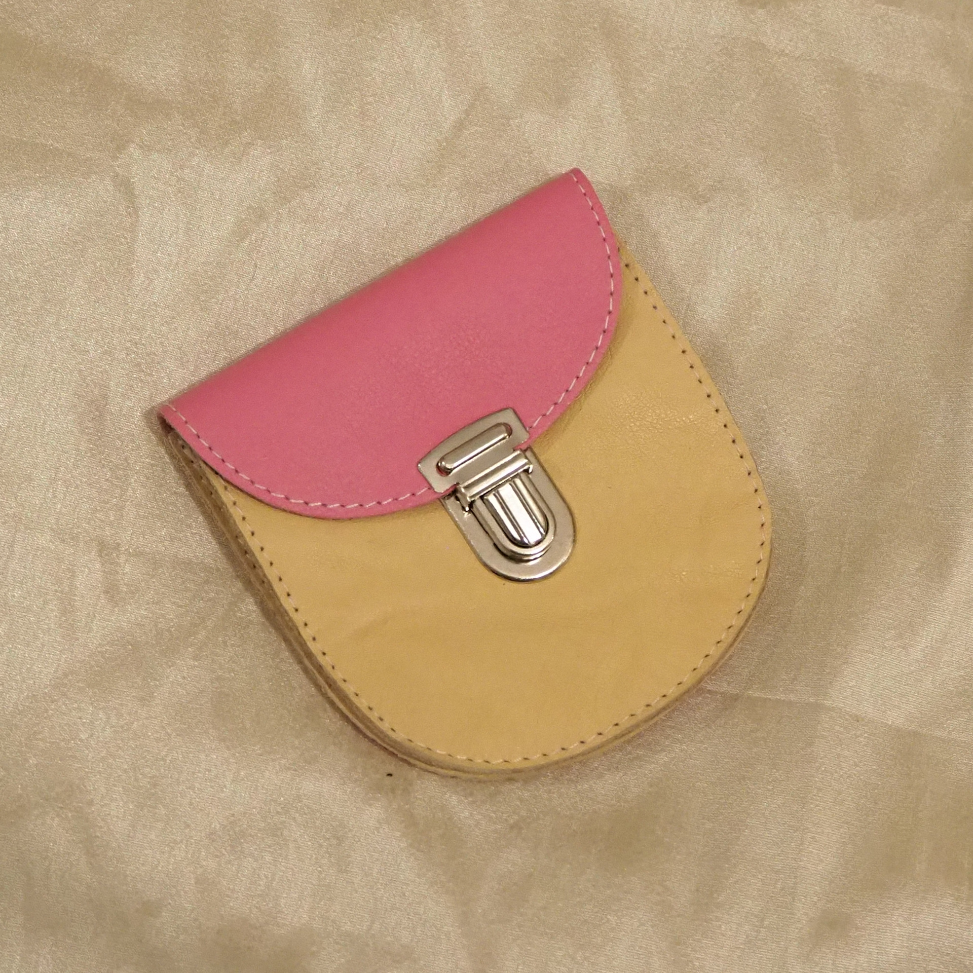 vaihto- eikä palautusoikeutta. Vaaleankeltaiset palat ovat kierrätysnahkaa, niiden pinnassa on kevyitä ruttuja/ taitoksia. Muuten Kukkaro on moittettomassa kunnossa.