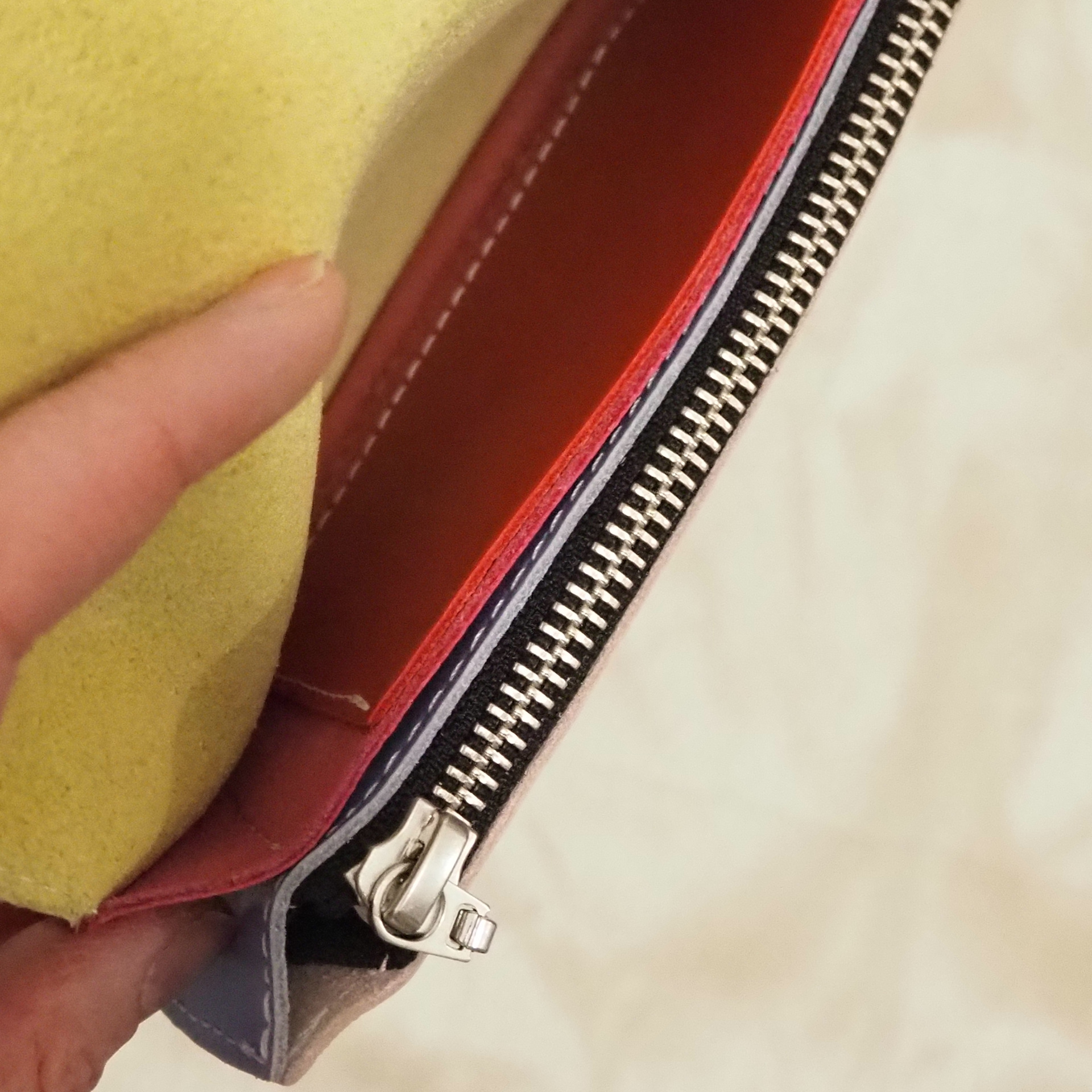 Kokeilukappale. Lompakko on moittettomassa kunnossa. Tämä Lompakko on monivärinen: läppä ja takaosa keltainen, etuosa vaaleanpunainen, välissä vaaleansininen ja pinkki kappale sekä sisällä punainen pikkutasku. Ale Lompakolla ei ole