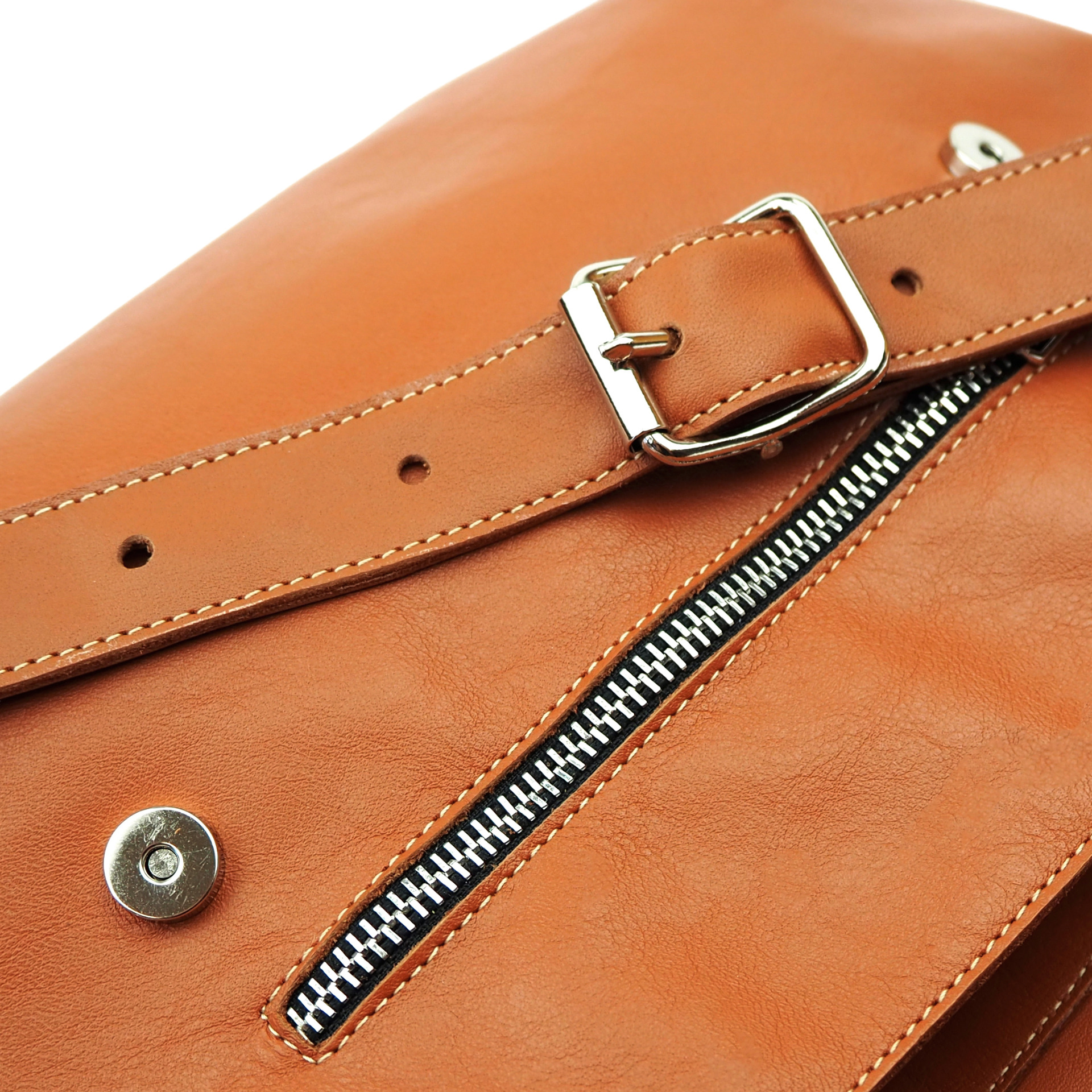 Laukussa on ommeltu paksu nahkainen olkahihna,