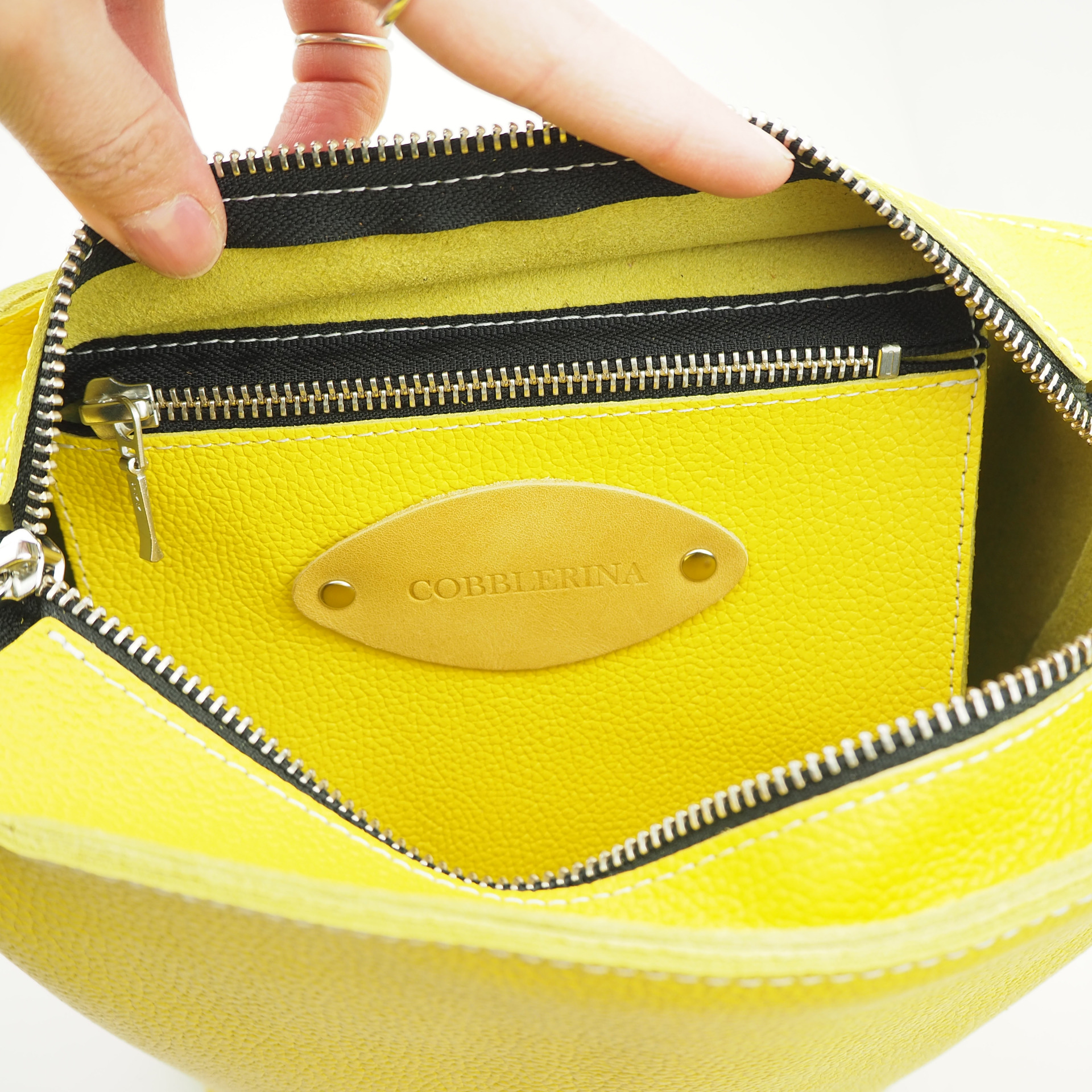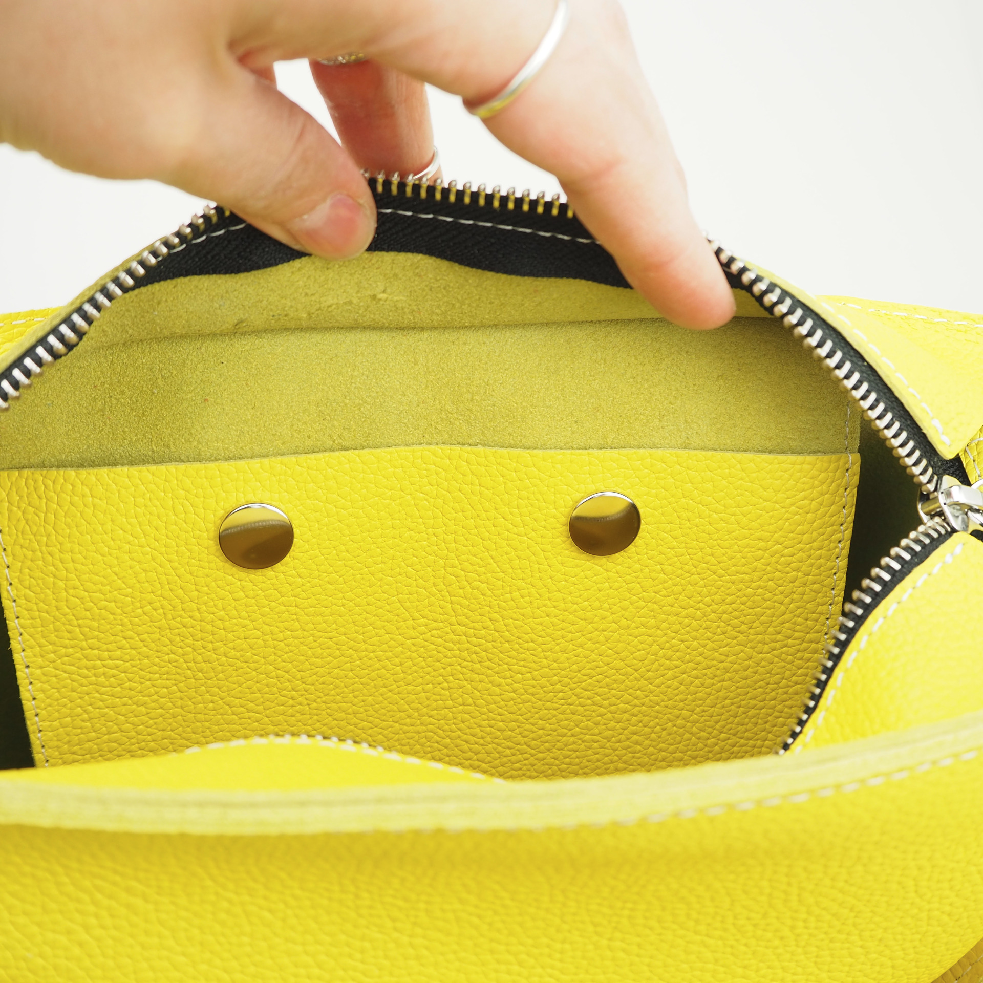Sisällä kaksi taskua joista toisen kiinnityksenä vetoketju ja toisen kaksi nepparia. Taskujen mitat 17 x 17 cm.