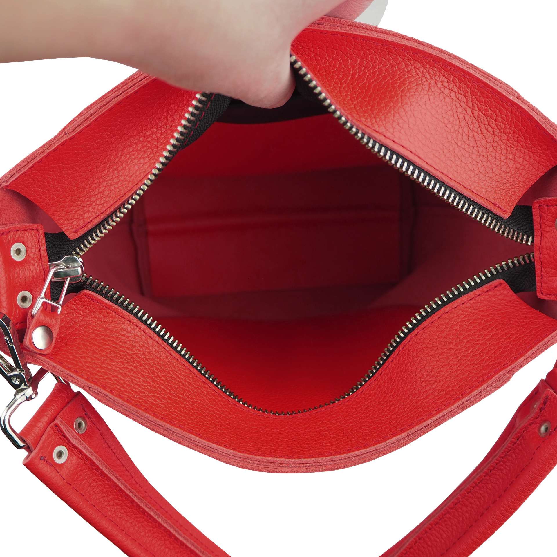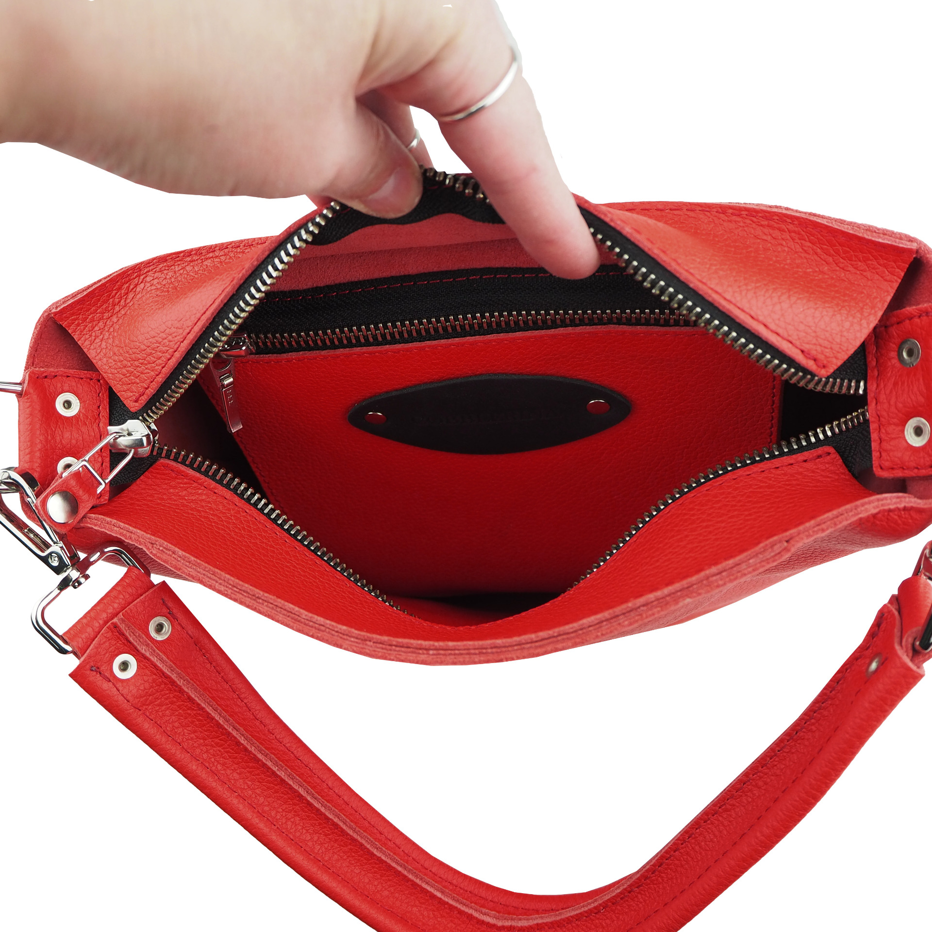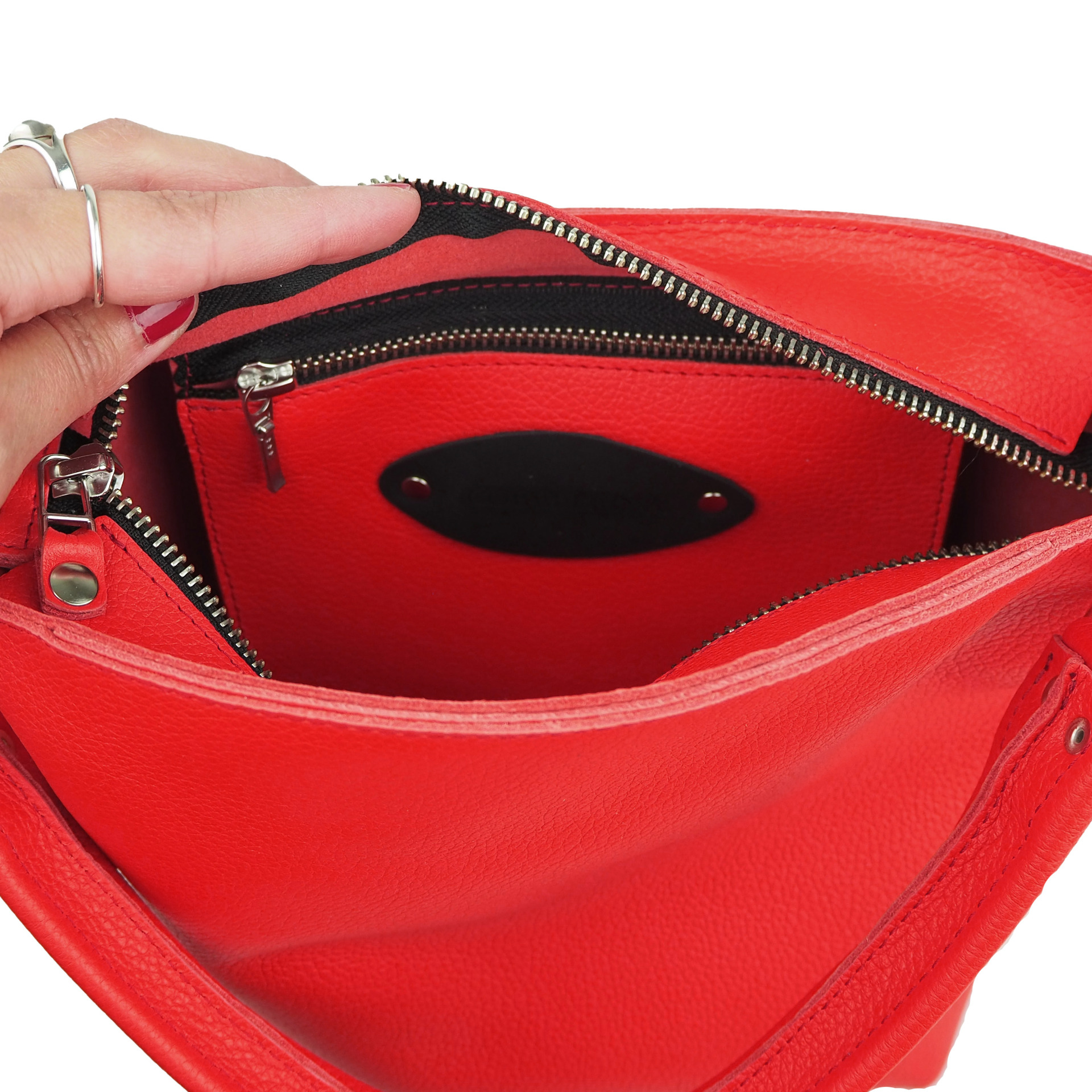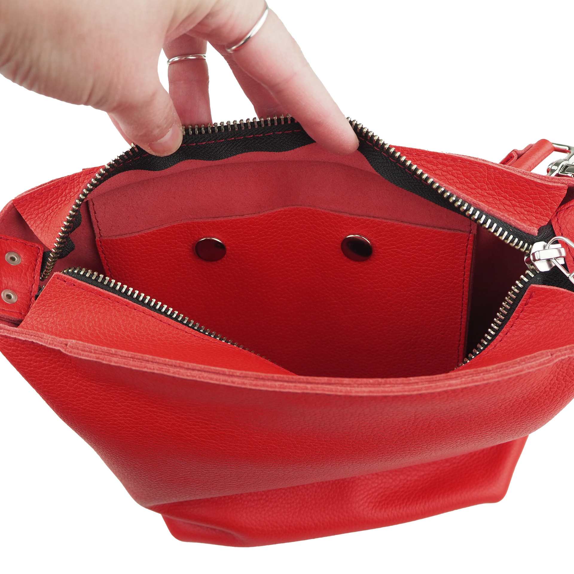 Sisällä kaksi taskua joista toisen kiinnityksenä vetoketju ja toisen kaksi nepparia. Taskujen mitat 17 x 17 cm.