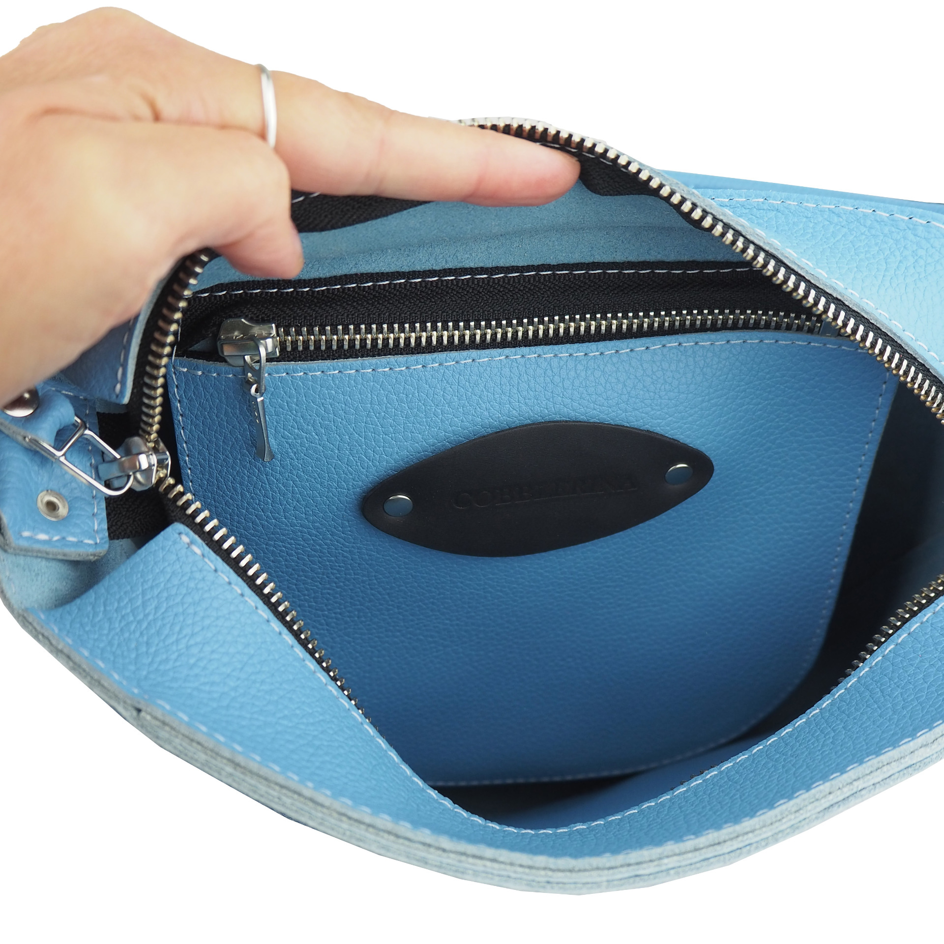 Sisällä kaksi taskua joista toisen kiinnityksenä vetoketju ja toisen kaksi nepparia. Taskujen mitat 17 x 17 cm.